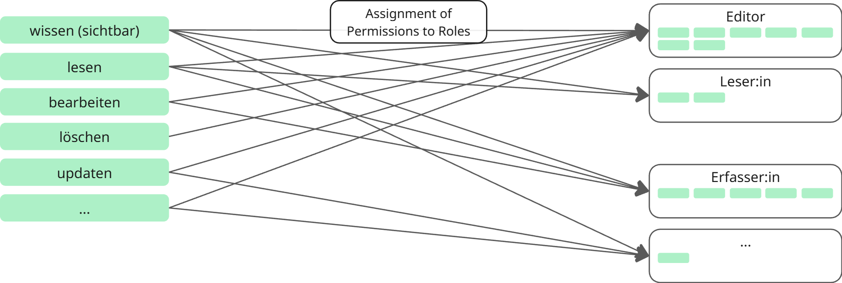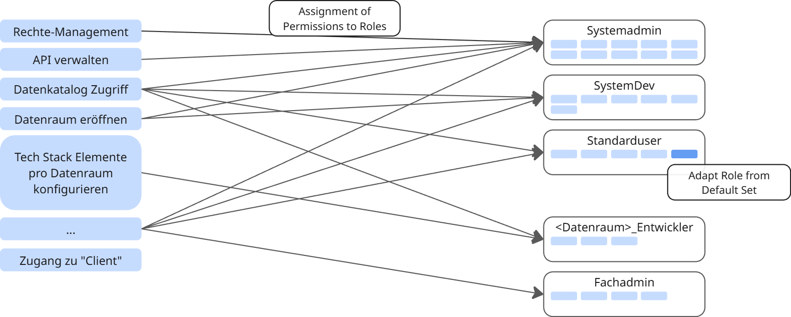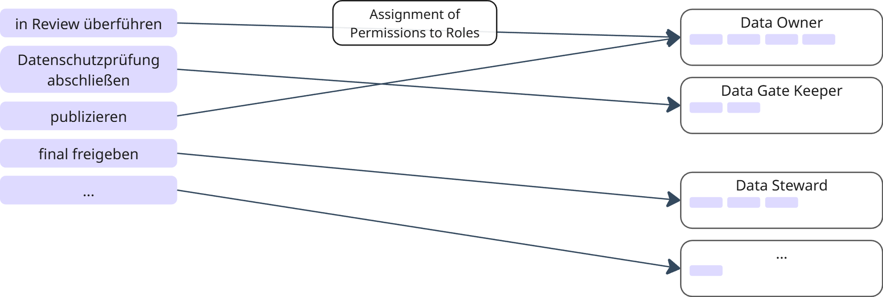 | Assignment | Zuordnung | Mapping defining who gets what where | Alice has Role "Data Analyst" in DataSpace "Traffic Data Domain" |