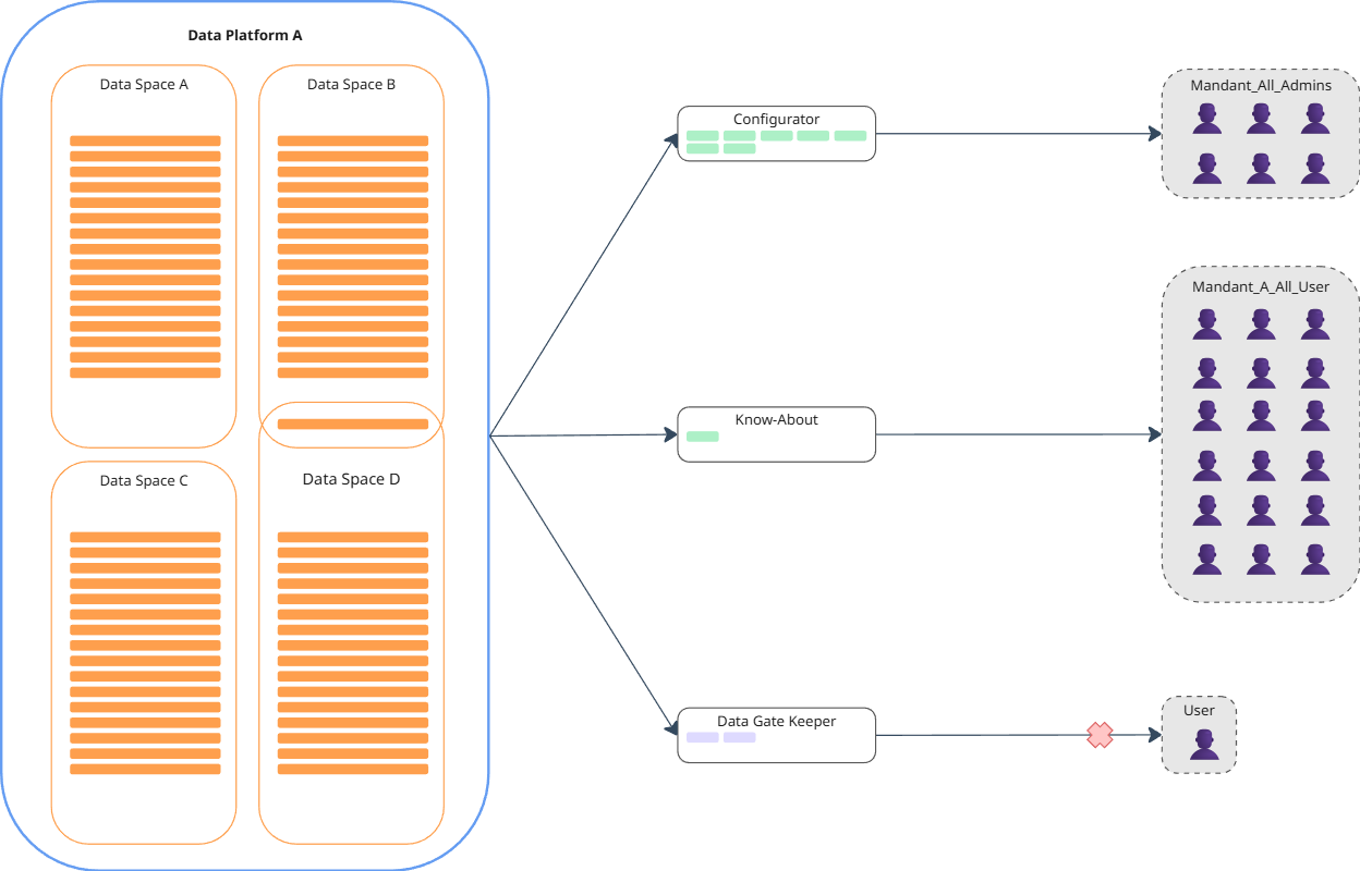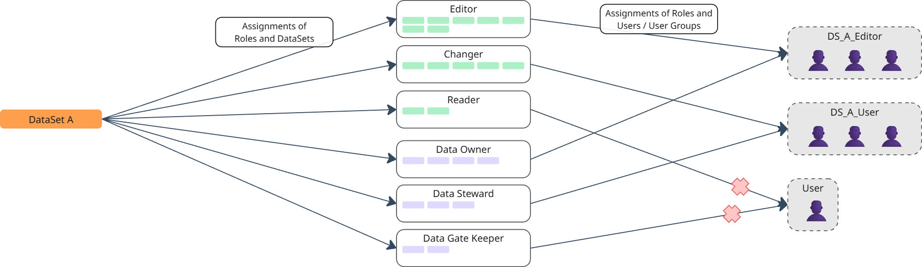 Data and governance roles can be assigned to groups on multiple levels. Important: This is a ternary assignment, i.e. a group is assigned a data or governance role in respect to a specific dataset, data space, or platform level.