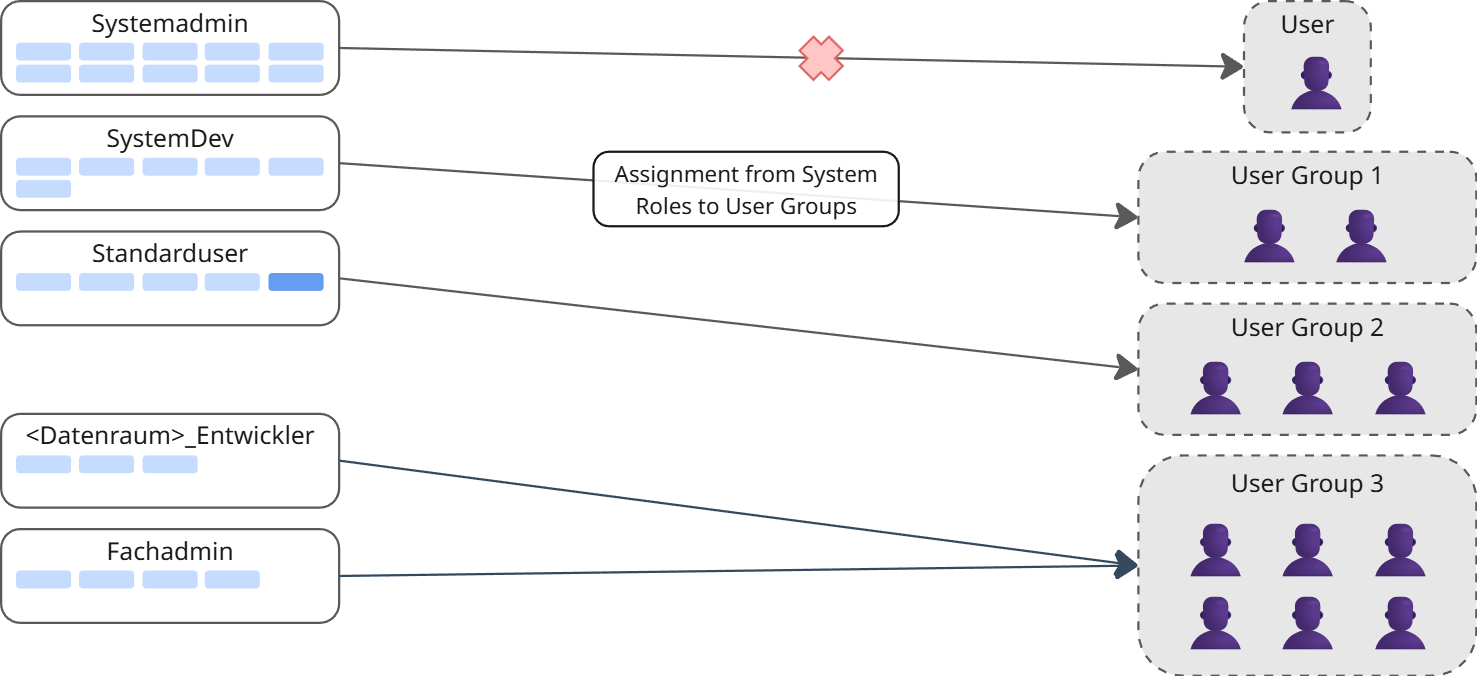 System roles are assigned to groups to enable platform access. This is a binary assignment, i.e. a group is directly assigned a system role.